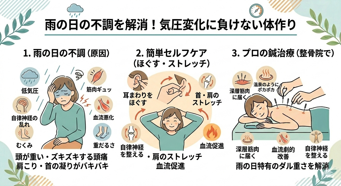 【雨の日の頭痛・だるさ】気圧の変化に負けない!体をスッキリさせるストレッチ&鍼ケア