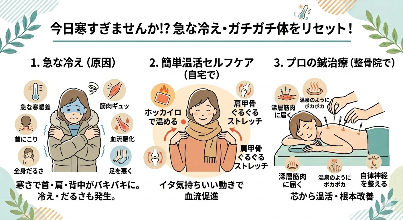 実はこういう「急に冷え込んだ日」は、整骨院への駆け込みが急増する要注意日なんです。今回は、寒さでガチガチになった体を今すぐリセットするケア方法をサクッとお伝えします!